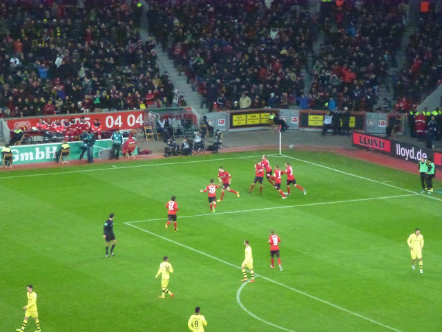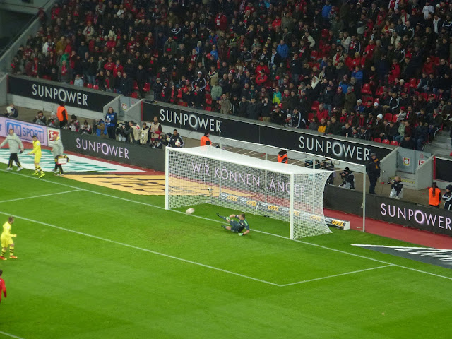 Terwijl de stadionspeaker en Leverkusen fans nog uit hun dak gaan ligt de bal er aan de andere kant alweer in. |